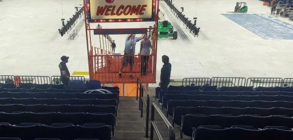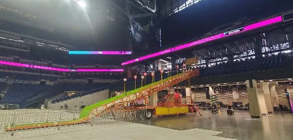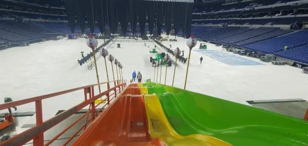 In order to connect the slide to the street level floor, some seating was removed as well as sections of railing. The Giant Fun Slide was postioned to slightly over hang the staircase in the stands. The Slide occupies a footprint of approximately 125ft long. The top of the structure is 36ft tall. Installing the Giant Fun Slide in the Lucas Oil Stadium for VeeCon involved driving down a ramp, through several hallways, and other ramps, which eventually led into the main floor of VeeCon. The slide took approximately 2 hours to set up and another day to install graphics and signage that was relevant to VeeCon 2023 in Indianapolis,IN.